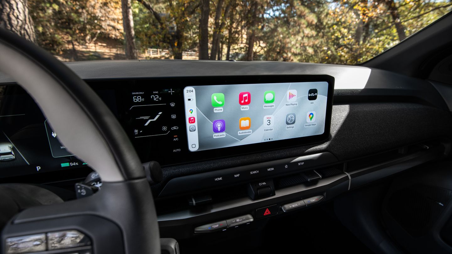 The cabin features nearly 30 inches of combined display - matching the EV9. Dual 12.3-inch screens (instrument cluster and infotainment) plus a 5.3-inch HVAC display integrate into a single panoramic panel. Kia's Connected Car Navigation Cockpit (ccNC) supports over-the-air updates, improving the vehicle post-purchase.